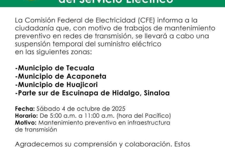 Tecuala โข Acaponeta โข Huajicori โข Escuinapa ยกQUE NO SE TE OLVIDE!La CFE informa a la poblaciรณn que habrรก suspensiรณn...