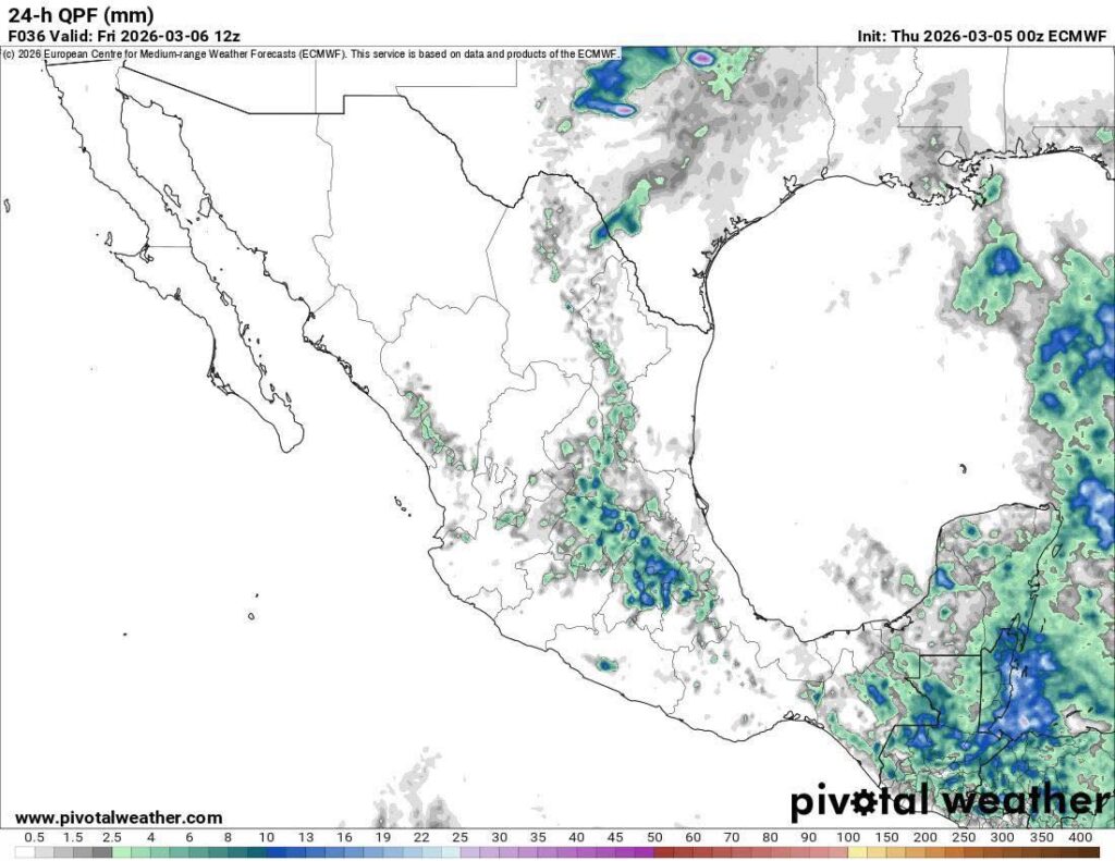 Hoy 05 de marzo se pronostica el potencial de registrarse precipitaciones en el norte, oriente, bajΓo, centro y sureste debido al ingreso de humedad en interacciΓ³n con canales de baja presiΓ³n en superficie.