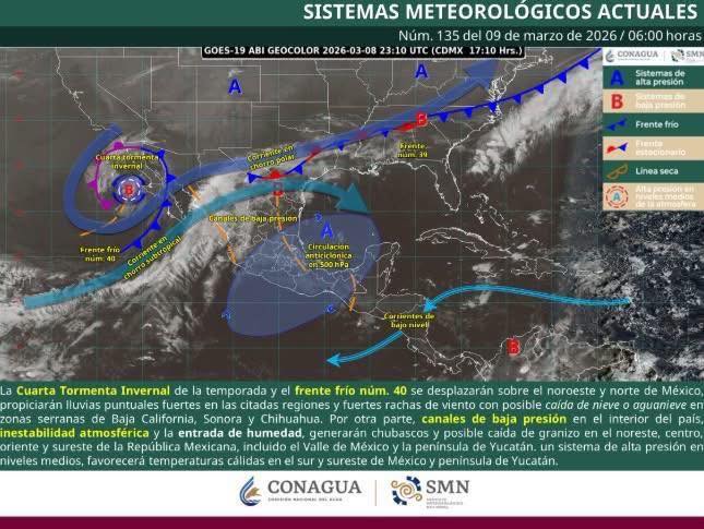 PacΓfico Centro: Cielo parcialmente nublado durante el dΓa y sin lluvia en la regiΓ³n. Por la maΓ±ana, ambiente fresco y frΓo con posibles heladas en zonas altas de Jalisco y MichoacΓ‘n. Durante la tarde, ambiente caluroso a muy caluroso; prevaleciendo la onda de calor en Jalisco (sur y suroeste), Colima (este) y MichoacΓ‘n (centro y suroeste). Viento del oeste y suroeste de 20 a 30 km/h en la regiΓ³n con rachas de 40 a 60 km/h en Nayarit y Jalisco.