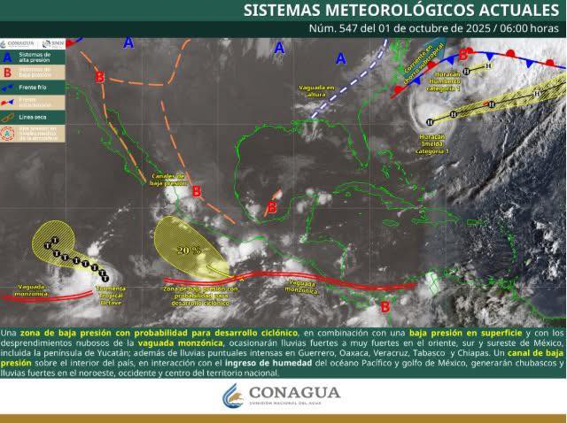 ๐ฆ๏ธPacรญfico Centro: Cielo medio nublado a nublado en el transcurso del dรญa, con lluvias puntuales fuertes en Nayarit, Jalisco, Colima y Michoacรกn, acompaรฑadas con descargas elรฉctricas y posible caรญda de granizo; ademรกs, podrรญan originar el incremento en los niveles de rรญos y arroyos, deslaves, inundaciones, encharcamientos y visibilidad reducida. Por la maรฑana, ambiente templado, asรญ como fresco con bancos de niebla en zonas altas. Durante la tarde, ambiente cรกlido a caluroso. Viento de direcciรณn variable de 10 a 20 km/h con rachas de hasta 45 km/h en la regiรณn.
