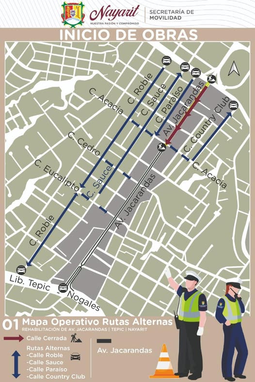El Gobierno del Estado de Nayarit, a travΓ©s de la SecretarΓa de Movilidad, informa que la avenida Jacarandas, en Tepic, presenta cierres temporales debido a los trabajos de renovaciΓ³n que se realizan en esta vialidad.