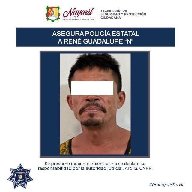 1.- Renรฉ Guadalupe โNโ โNโ, de 41 aรฑos, en el municipio de Ruiz, dando cumplimiento a la orden de aprehensiรณn por su presunta participaciรณn en el hecho delictuoso de contra la salud, en agravio de la sociedad.