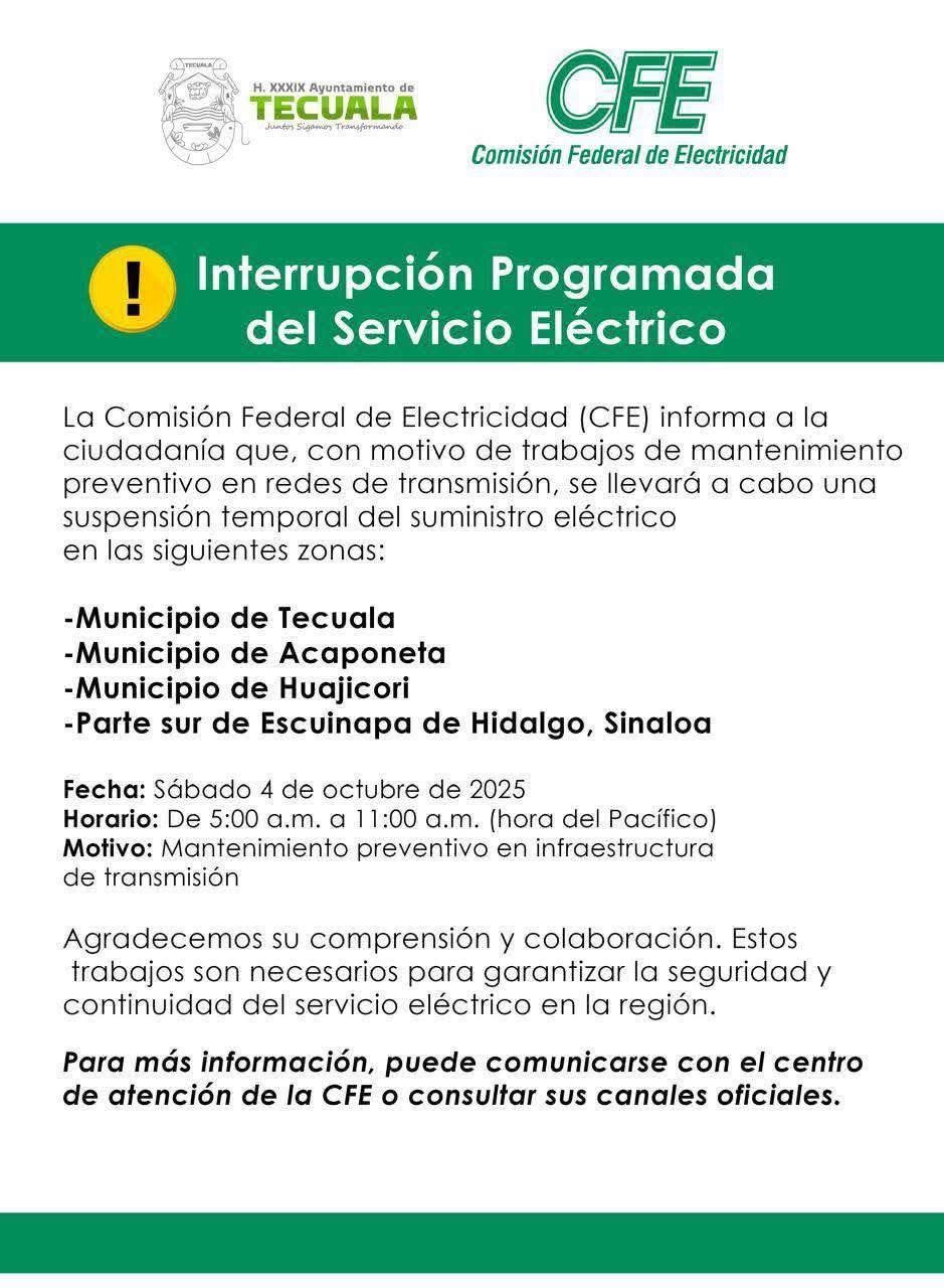 La CFE informa a la poblaciΓ³n que habrΓ‘ suspensiΓ³n temporal del servicio elΓ©ctrico este sΓ‘bado 4 de octubre de 2025 β° de 5:00 a.m. a 11:00 a.m.