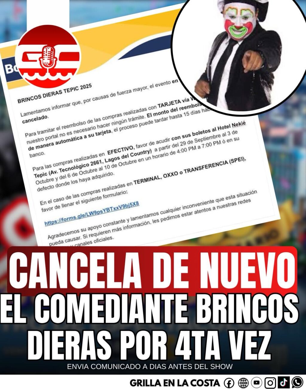 Por cuarta vez en el aรฑo el comediante brincos dieras volviรณ a cancelar su show en la ciudad de Tepic a solo 1 dรญa de su espectรกculo, la empresa encargada de vender los boletos y el lanzaron un comunicado el dia de hoy para todos los fans que ya habรญan adquirido sus entradas para el dia de maรฑana. Ofreciendo el reembolso integro.