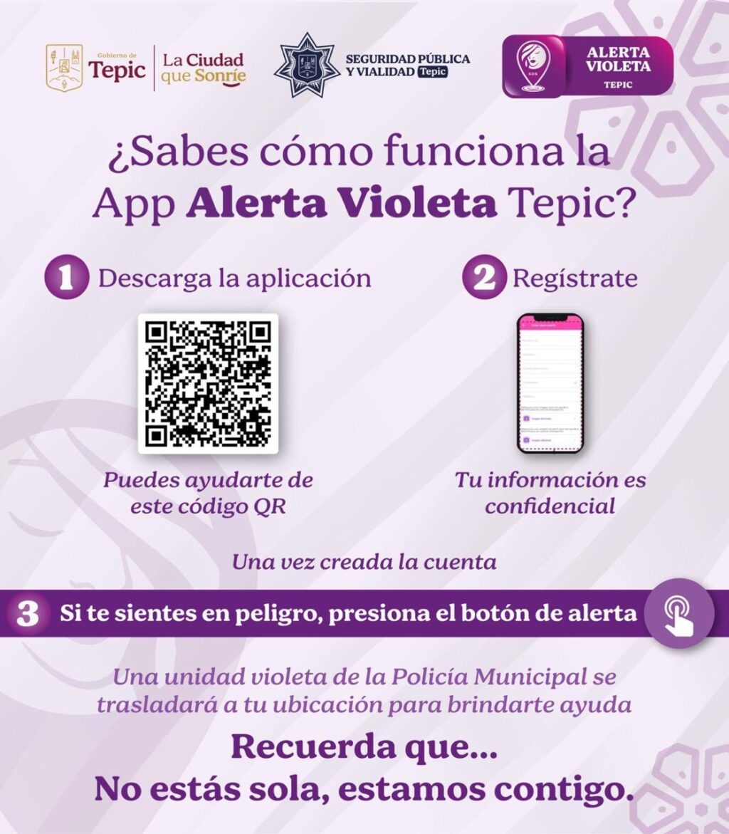 El Gobierno de Tepic, a travรฉs de la Direcciรณn de Seguridad Pรบblica y Vialidad, impulsa el uso de la aplicaciรณn mรณvil โAlerta Violeta Tepicโ, una herramienta diseรฑada para brindar atenciรณn inmediata a mujeres que se encuentren en peligro.