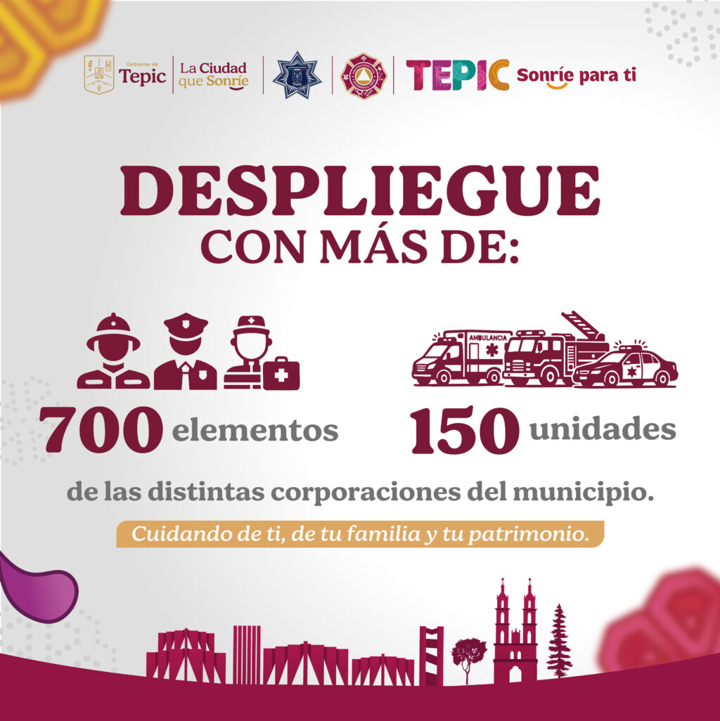 Tepic refuerza la seguridad y la atenciรณn ciudadana con un impresionante despliegue operativo que incluye mรกs de 700 elementos de distintas corporaciones y 150 unidades listas para actuar en todo el municipio.